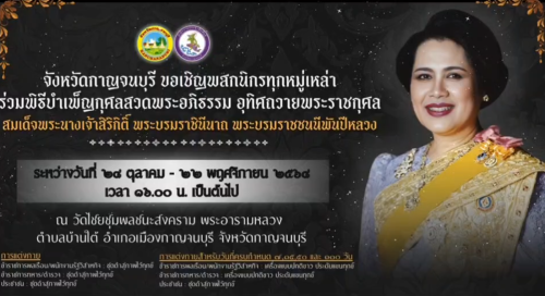 จังหวัดกาญจนบุรี ขอเชิญพสกนิกรทุกหมู่เหล่า ร่วมพิธีบำเพ็ญกุศลสวดพระอภิธรรม อุทิศถวายพระราชกุศล สมเด็จพระนางเจ้าสิริกิติ์ พระบรมราชินีนาถ พระบรมราชชนนีพันปีหลวง